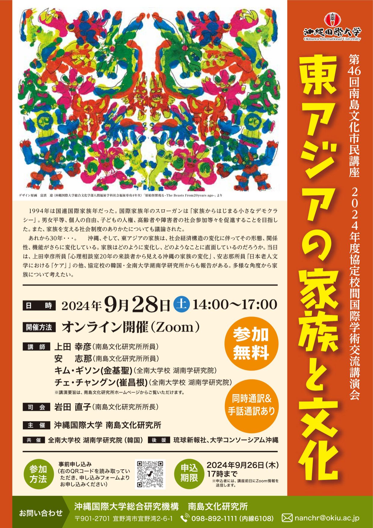 南島文化研究所では、下記のとおり第46回南島文化市民講座・2024年度協定校間国際学術交流講演会「東アジアの家族と文化」を開催しました。