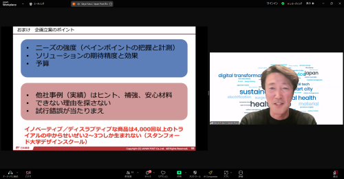 また、企画立案のポイントとして「他社事例(実績)はヒント、補強、安心材料にしかならない、できない理由を探さない、試行錯誤が当たりまえ」と仰られていたのが非常に印象的で今後の講義での取り組みや自身の考え方に活かしたいと思いました。
