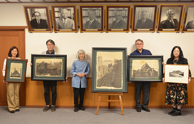 今回寄贈された作品5点(沖縄の島々、地中海の島々)を囲んでの記念撮影