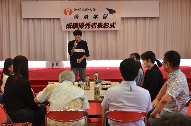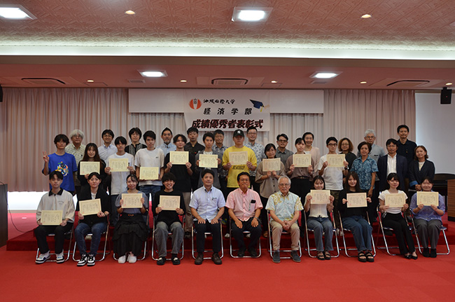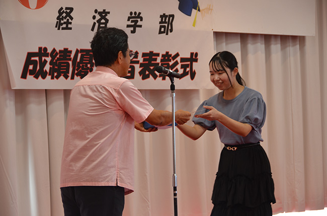 2024年10月18日(金)、厚生会館4階ホールにて、2024年度経済学部成績優秀者表彰式が開かれました。前年度の成績に基づいて、各学科各学年のもっとも優れた成績を収めた学生(同率五位まで)が表彰されます。今年は、経済学科16名、地域環境政策学科18名が表彰され、村上了太経済学部長から表彰状と記念品が授与されました。