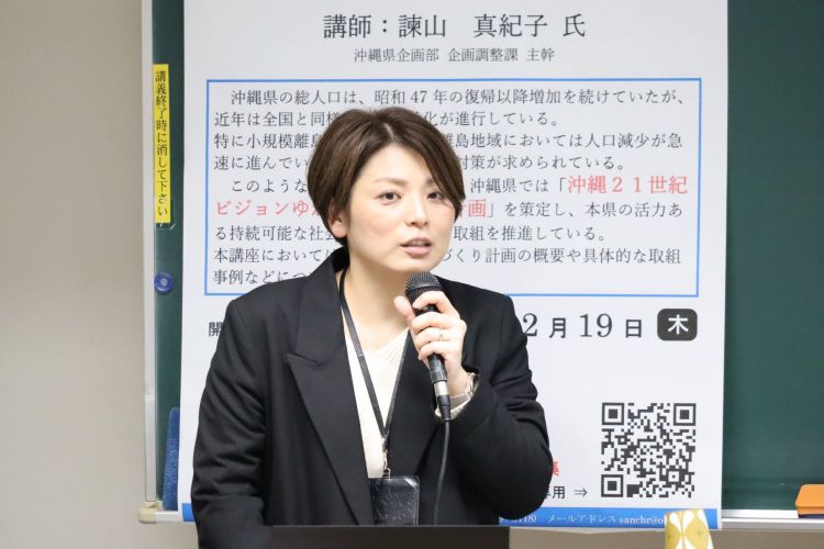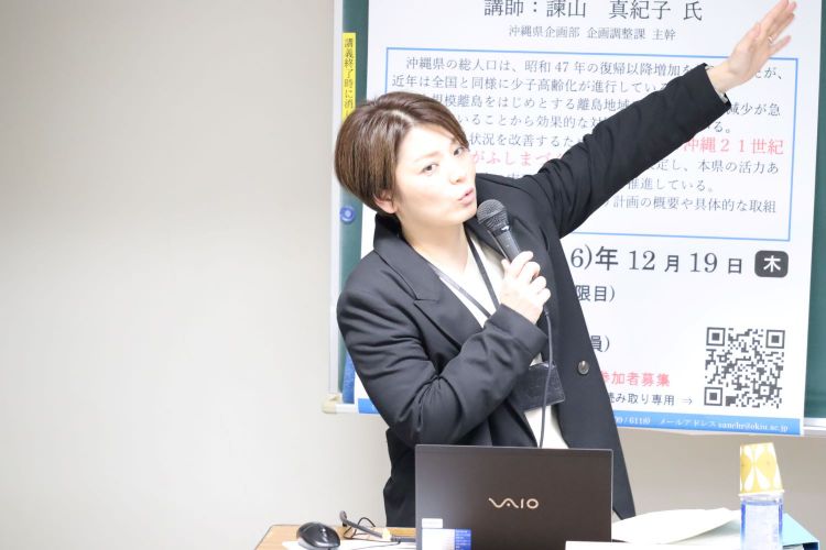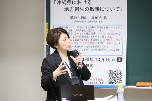 勉強会では沖縄県における地方創生の取組として「21世紀ビジョンゆがふしまづくり計画」の概要や取り組み事例について講演いただいた。