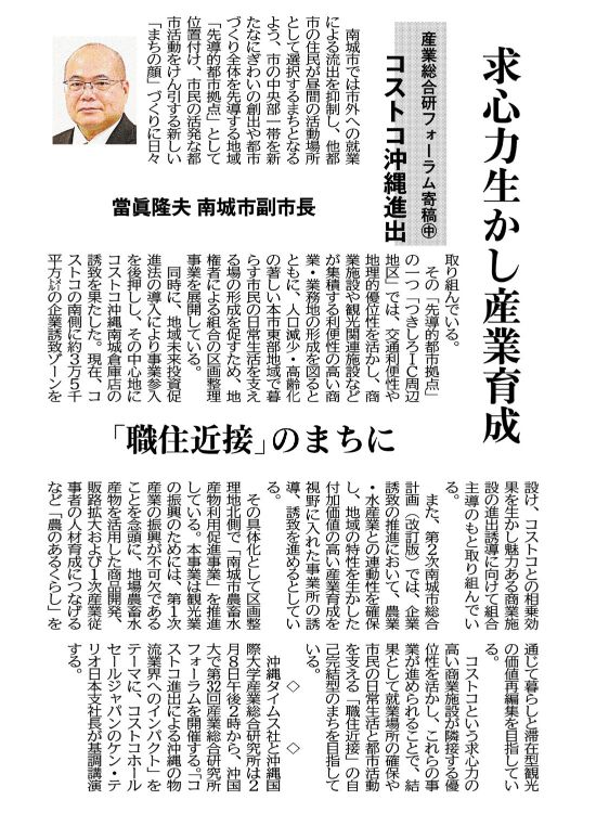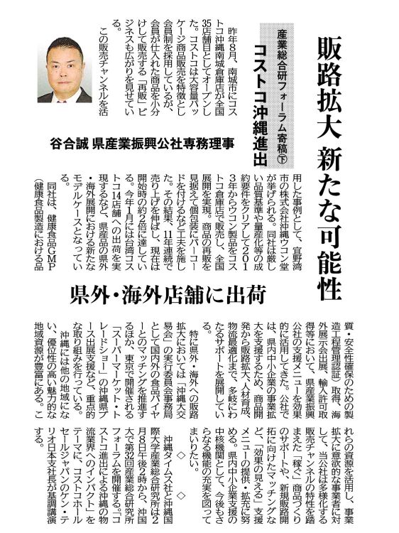 4. 話題のコストコの社長の講演は大変意義深いと思います。また、南城市の発展に貢献するのであろうとの立場での副市長のお話も意義深いものであります。コストコを活用したウコン堂の販路拡大については他の県内業者のベストプラクティスになり得ると思います。