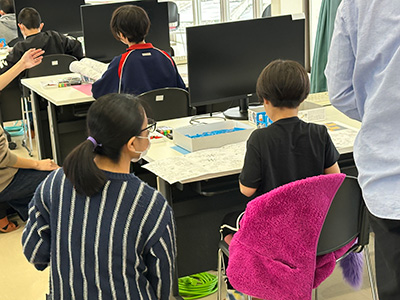産業情報学科の学生がチューターとして参加しました。チューターの学生らも、ものづくりの楽しさと、子供らと一緒に問題を解決する喜びを実感できる貴重な機会になりました。今後もこのようなイベントを企画し、地域の皆さんが気軽に最先端の学びに触れられる場を提供していきたいと思います。