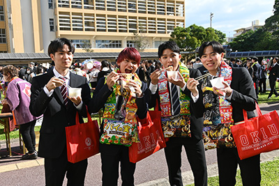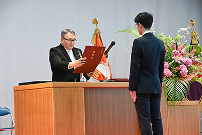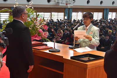 その後、安里肇学長による告辞が行われ、全学生を代表し総合文化学部英米言語文化学科のI GEDE OKTA ARTHA TARUNA(イ ゲデ オクタ アルタ タルナ)さんが答辞を読み上げました。
