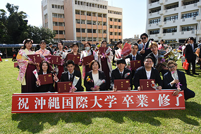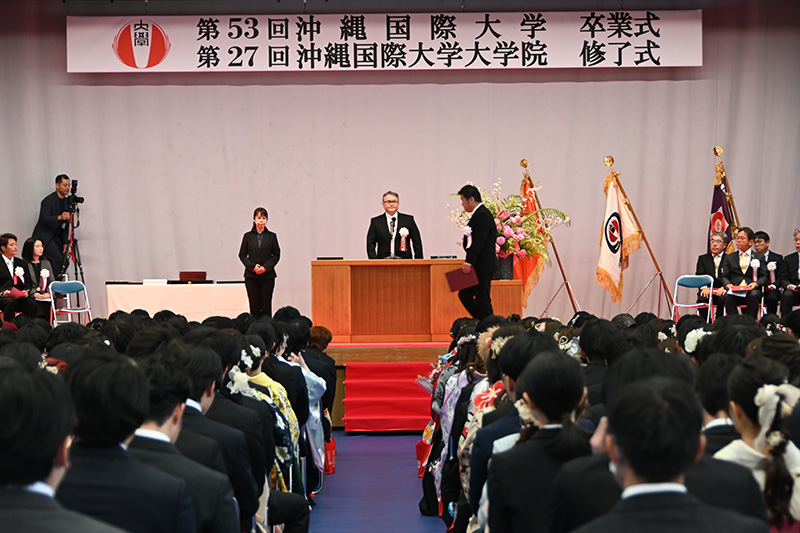 本日、無事に卒業を迎えた卒業生・修了生の皆さん、ご卒業ご修了、誠におめでとうございます。本日、何の制限もなく、晴れやかにこの日を迎えられたことを教職員一同、嬉しく思っております。社会に出てもさまざまな壁に立ち止まることがあるかと思いますが、人類が経験したことない世界的な感染症の広がりのなか沖縄国際大学で学生生活を送ったこの経験をふまえ、困難を恐れず自由に未来を切り拓き続けてください!