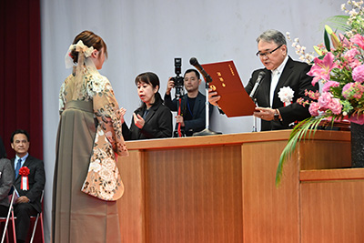 各学科卒業生及び大学院修了生の代表に、卒業証書・学位記が授与された後、学業や課外活動・スポーツなどで顕著な功績があり、他学生の模範となる卒業生に対して表彰が行われました。表彰者は以下の通りです。