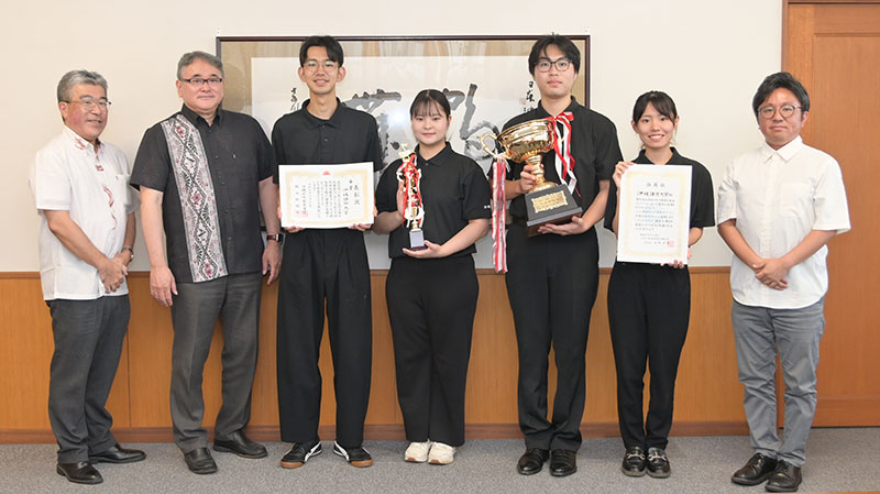 7月31日(木)結果報告のため、安里学長を表敬訪問しました。訪問したのは、部長、副部長ほか2名の学生と、顧問の藤波教授、副顧問の仲里課長補佐です。