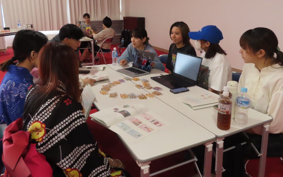 日本語の授業の一環として実施した日本・沖縄事情の授業では、研修生は浴衣を着用し、本学学生による日本の歴史や礼儀作法についての学習ブースを回り学習しました。ブースの一つには、茶道体験ブースもあり、茶道部の方々がお茶のたて方をレクチャーしながら、お茶と和菓子を味わいました。また、日本語学習の後半では、5号館1階ホールにて自国紹介の展示会が行われました。研修期間中に交流のあった学生や、国外協定校への留学に関心のある学生が多く参加していた様子が見受けられました。