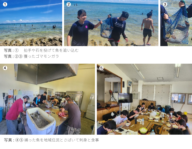(1)沖縄の追い込み漁に体験:数人の漁師が連携して網に魚を追い込み、捕獲する伝統的な漁法です。近年は労働力の不足などにより、途絶えつつあるが、貴重な体験となりました。石を投げたり、拍手で魚を網に追い込んだり、その時に獲った大きな魚がゴマモンガラです。漁師の方のご協力によりさばいて刺身と煮つけで夕飯としました。