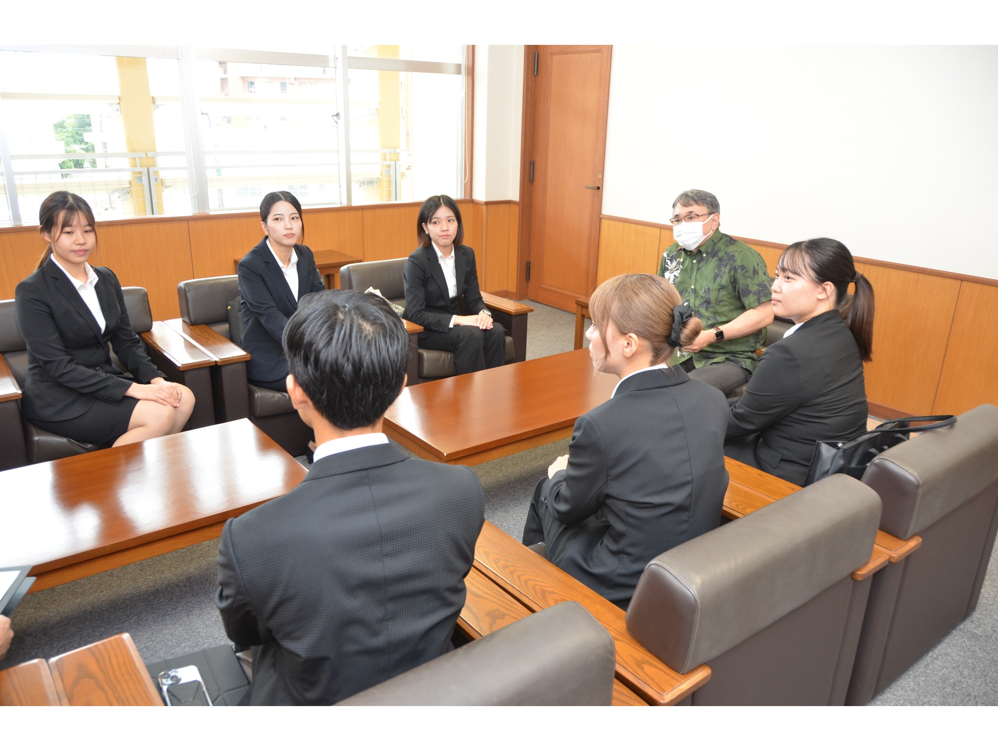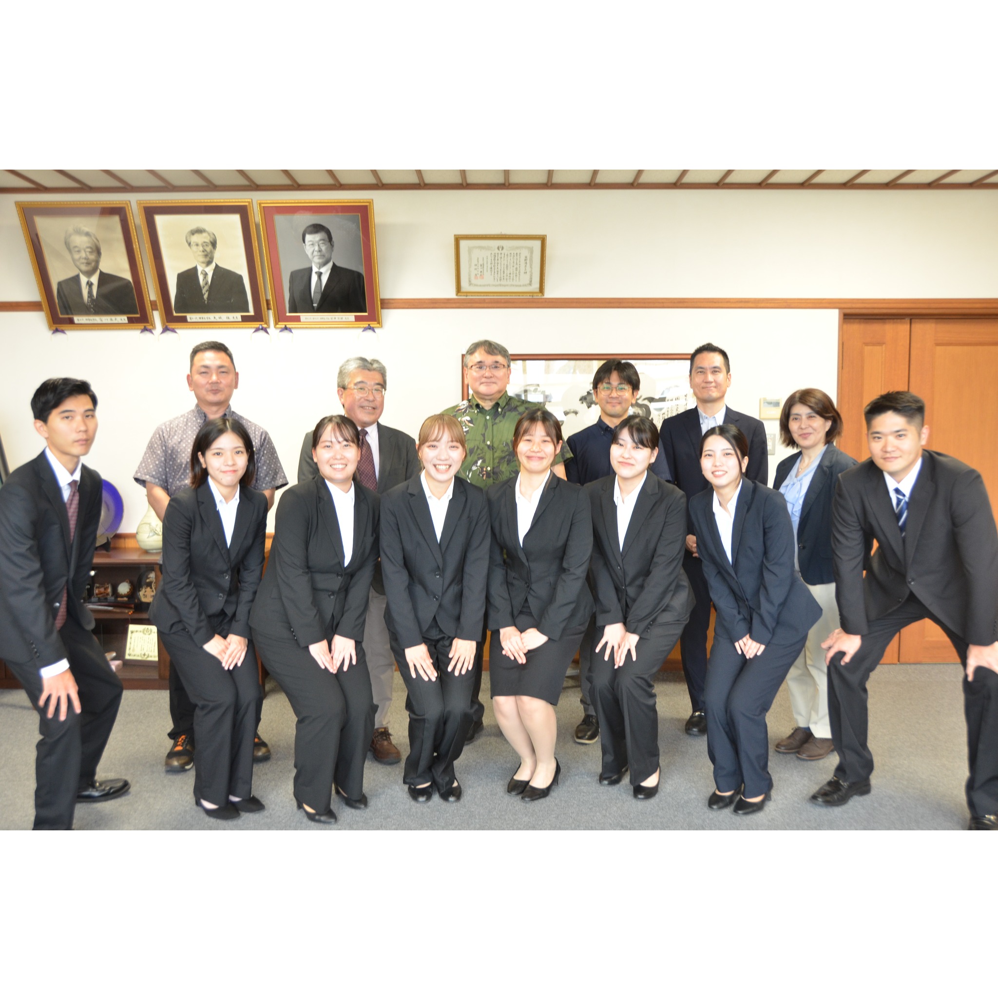 左前:喜納琉希さん(小学校課程)、徳永陽夏さん(商業科)、安慶名穂花さん(英語科)、山下佳奈さん(社会科)、宇地原青夏さん(国語科)、仲宗根礼美香さん(国語科)、新垣美季さん(国語科)、奥間常さん(英語科)