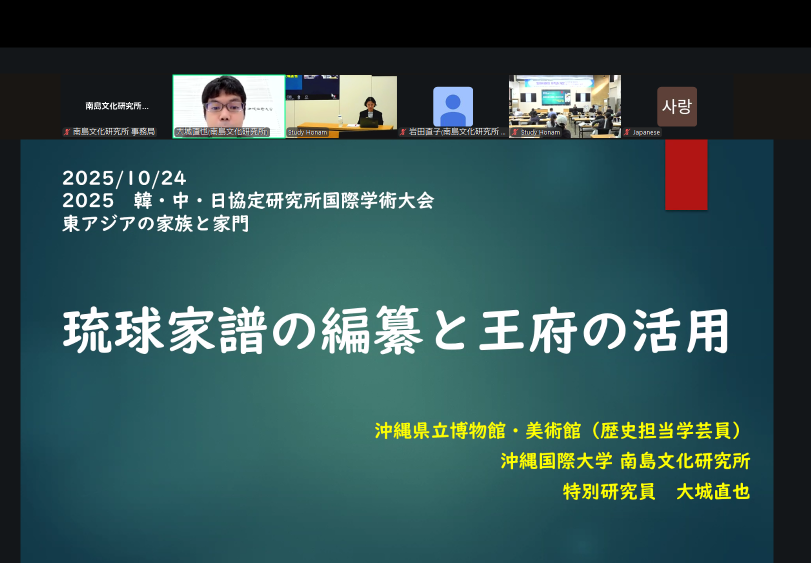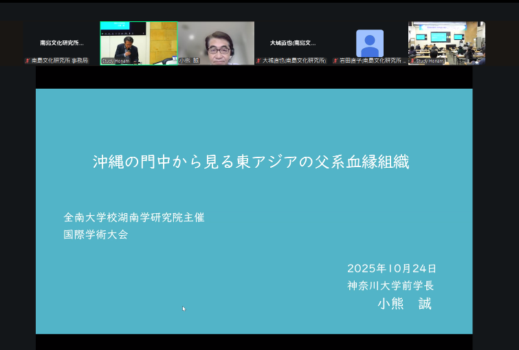 南島文化研究所では、学術交流協定を結んでいる全南大学校湖南学研究院(韓国)主催の国際学術大会にオンラインで参加、発表を行いました。