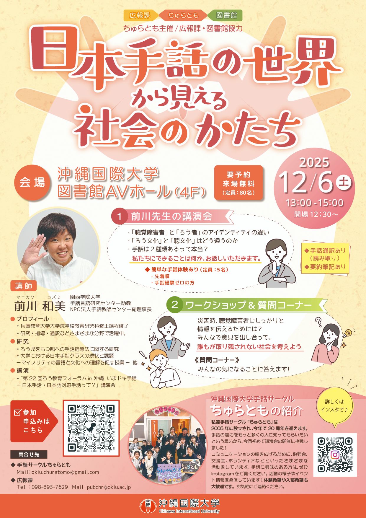 12月6日(土)、手話サークルちゅらとも主催の講演会「日本手話の世界から見える社会のかたち」を開催いたします。