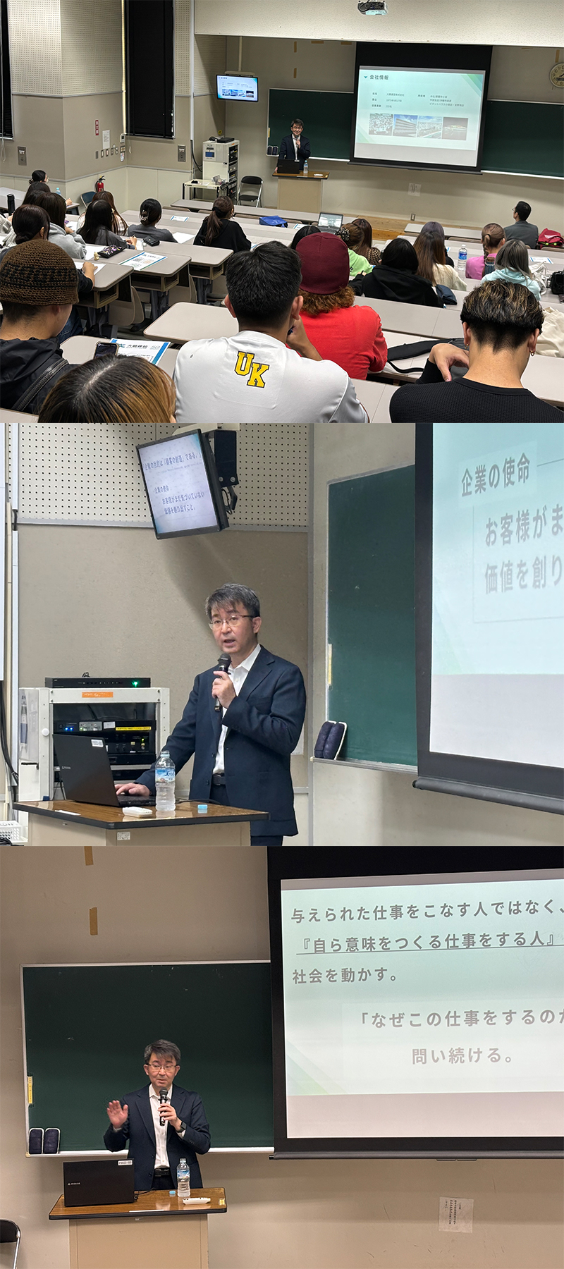 学生たちにとっては、経営の最前線で活躍されている経営者の言葉を通して、「働くことの意味」や「価値創造とは何か」について深く考える、貴重な機会となりました。講義後の質疑応答でも、将来の進路や仕事観に関する質問が数多く寄せられ、学生一人ひとりにとって大きな学びの時間となった様子がうかがえました。