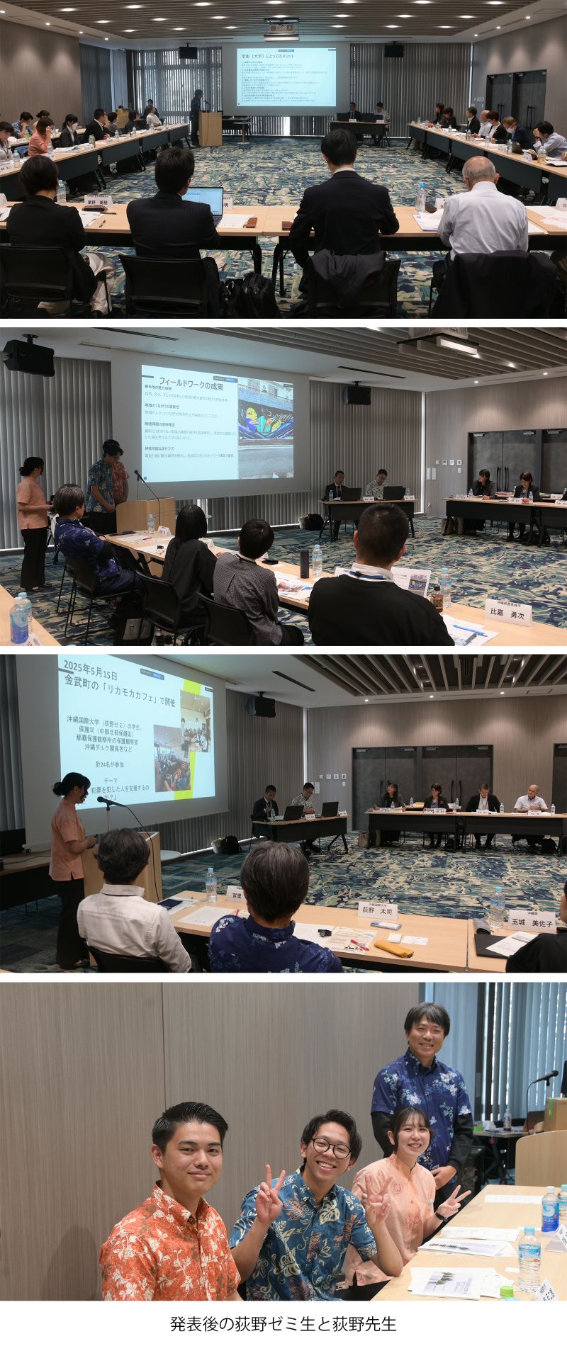 荻野先生からは、学生が再犯防止プロジェクトに参加する意義について、ゼミ生の具志竜輝さん、上原巨二朗さん、田場女偉さんからは、フィールドワークの成果と金武町でのカフェ運営、今後のプロジェクト案などについて報告しました。
