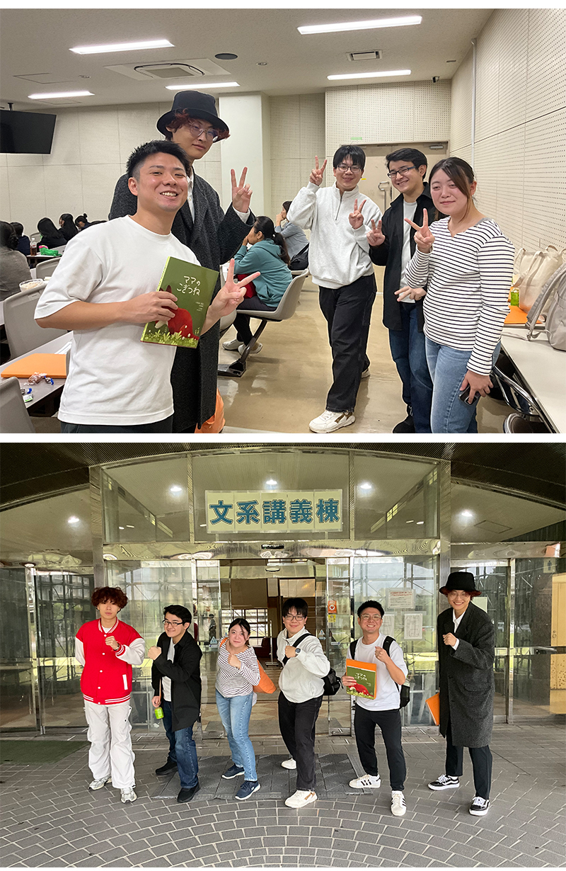 宮城 碧生さん(日文3年)、植村 桃子さん(日文1年)、三谷 拓士さん(人福 演劇部部長)、金城 希愛さん(社文4年)、張 思韓さん(日文2年)