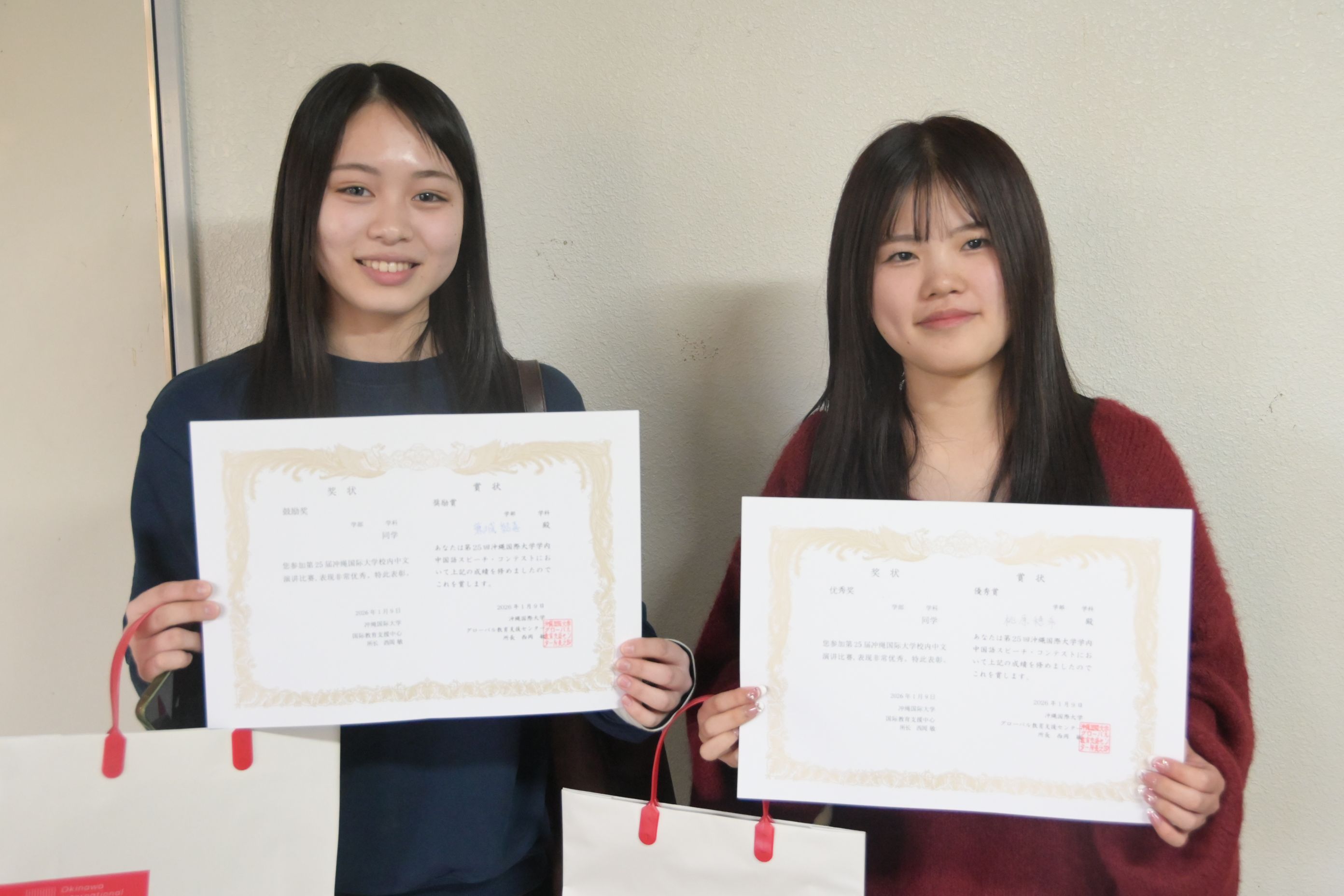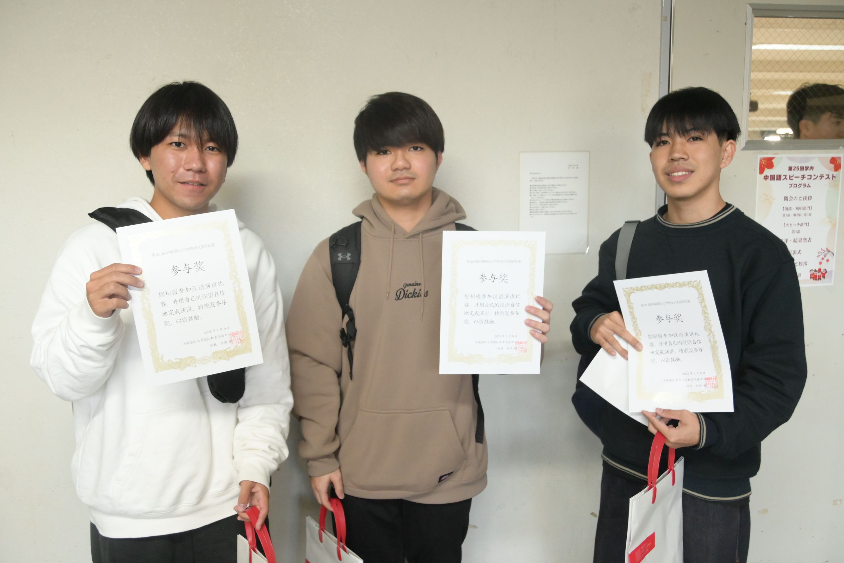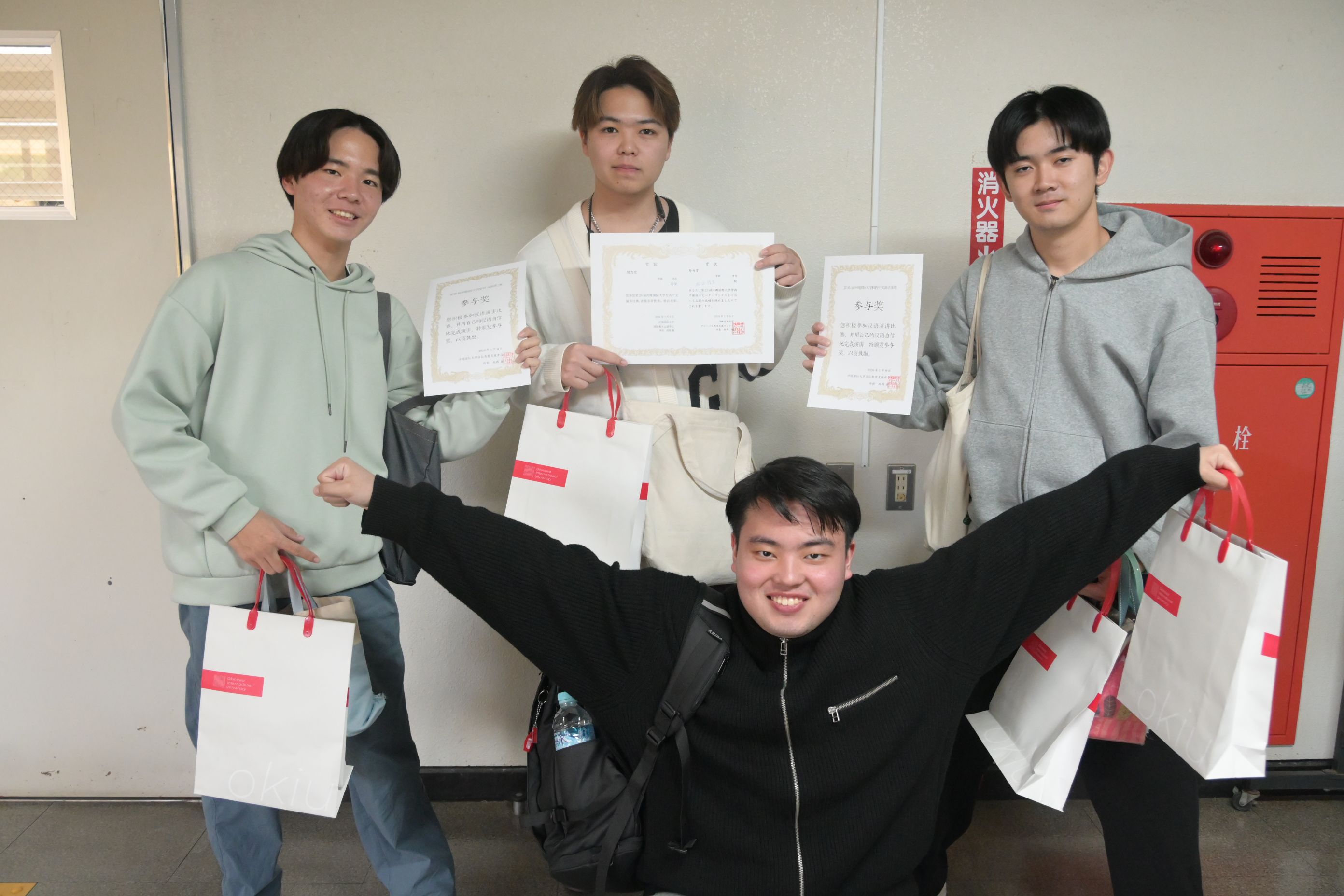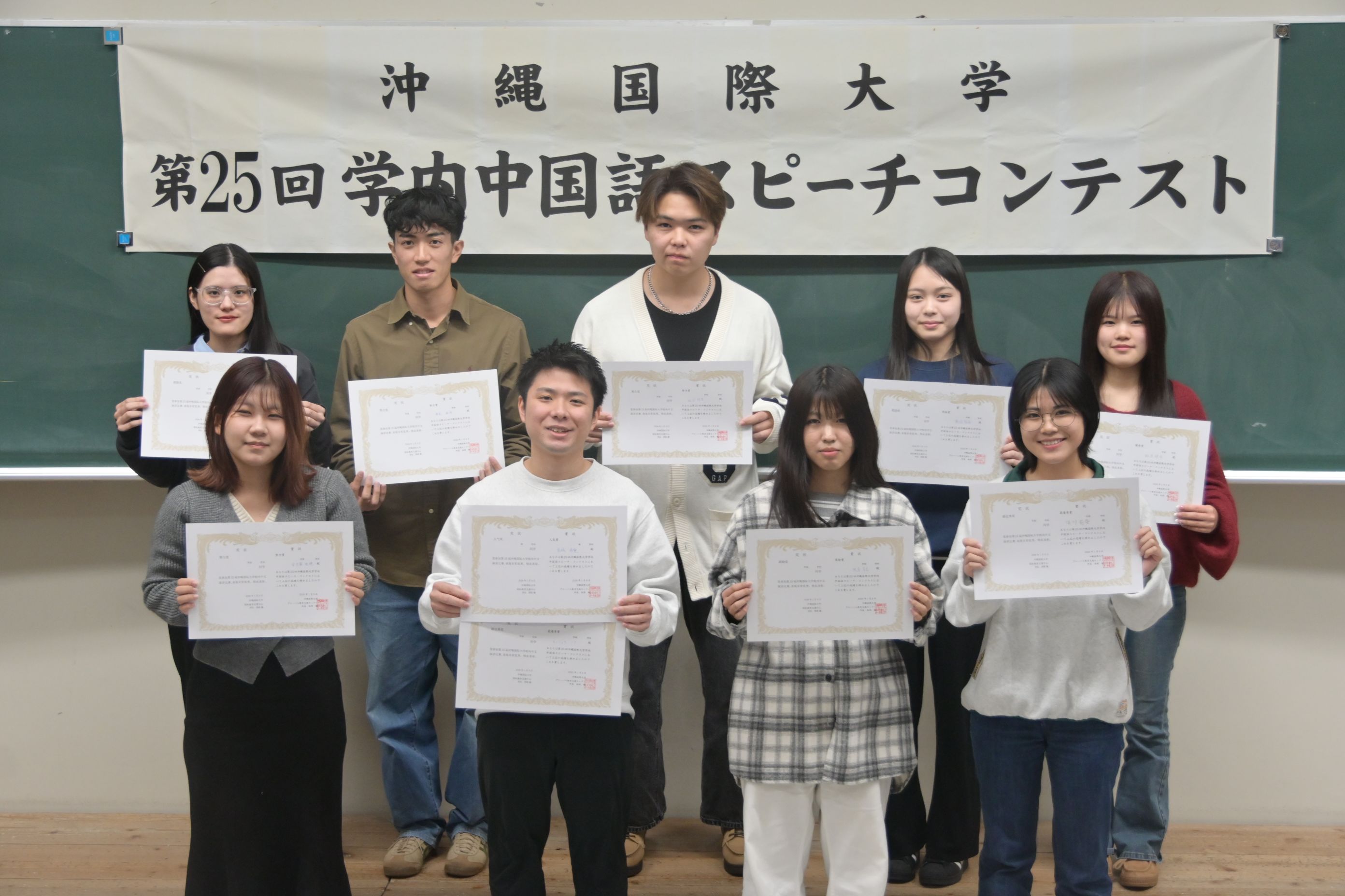 普段の学習の成果を表すことができるスピーチコンテストに多くの学生が積極的に参加して、中国語の学習に対する熱意を感じました。特に最近沖縄国際大学の学生の皆さんが自発的にこうしたスピーチコンテストや中国語検定試験に挑んでいる姿を見て、指導する教員としてはとても嬉しく思います。頑張って下さい(加油!!)