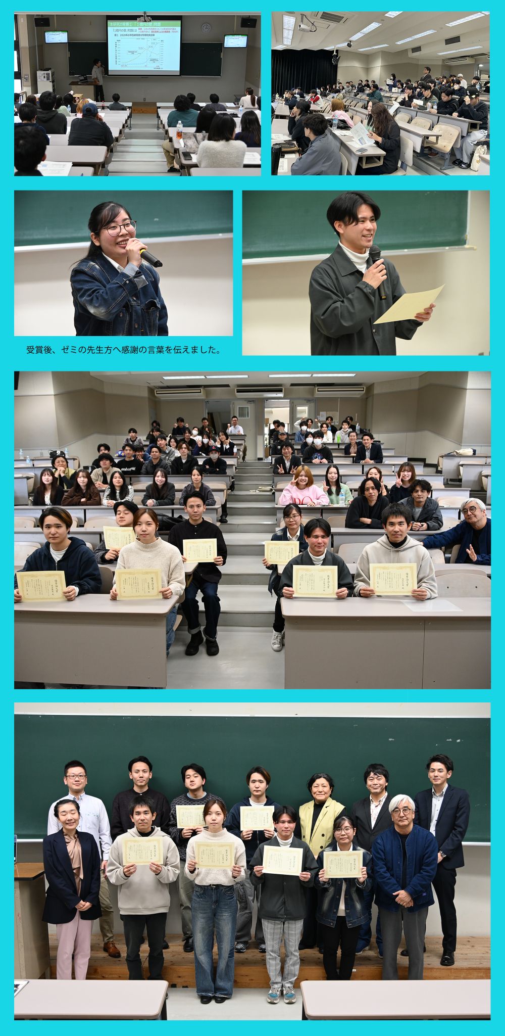 教員だけでなく聴衆の3・4年生とからも活発に質問が出され、大変盛り上がりました。報告者7名全員が経済学科「優秀論文賞」として認められ、表彰式が行われました。