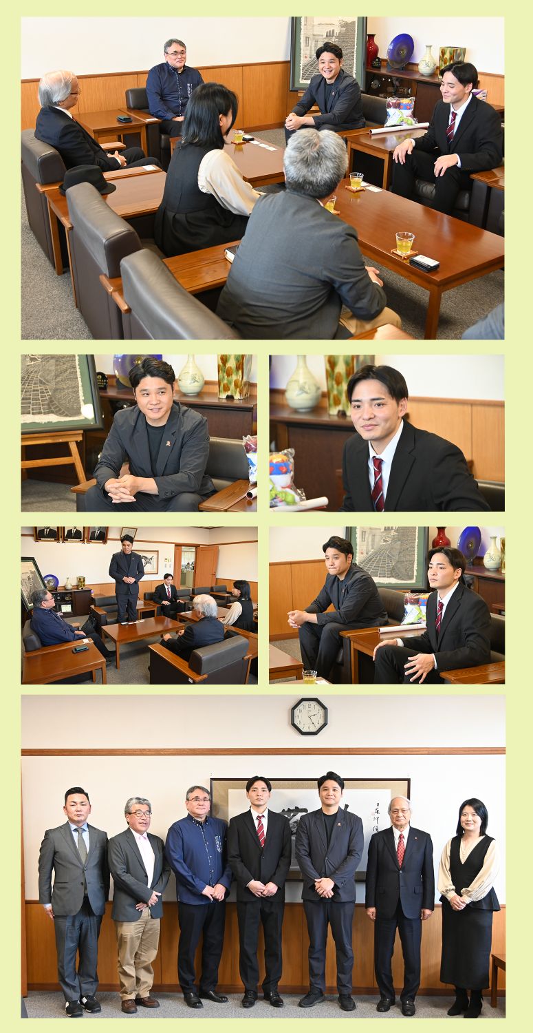 それに伴い、2026年2月26日(木)、株式会社琉球コラソンの石田孝一ゼネラルマネージャーとご本人による入団報告を兼ねて、学長表敬訪問が行われました。