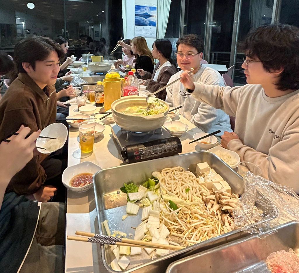 夕食時にはセミナーハウスからお鍋の提供があり、参加者は「鍋奉行」について英語で説明し合い、大いに盛り上がりました。食事を終え、片付けをした後は、海外ドラマ“Lie to Me”を鑑賞しました。鑑賞したドラマでは、主人公2人がアメリカ英語とイギリス英語を話すため、発音や言い回しの違いを比較することで楽しみながら学びました。