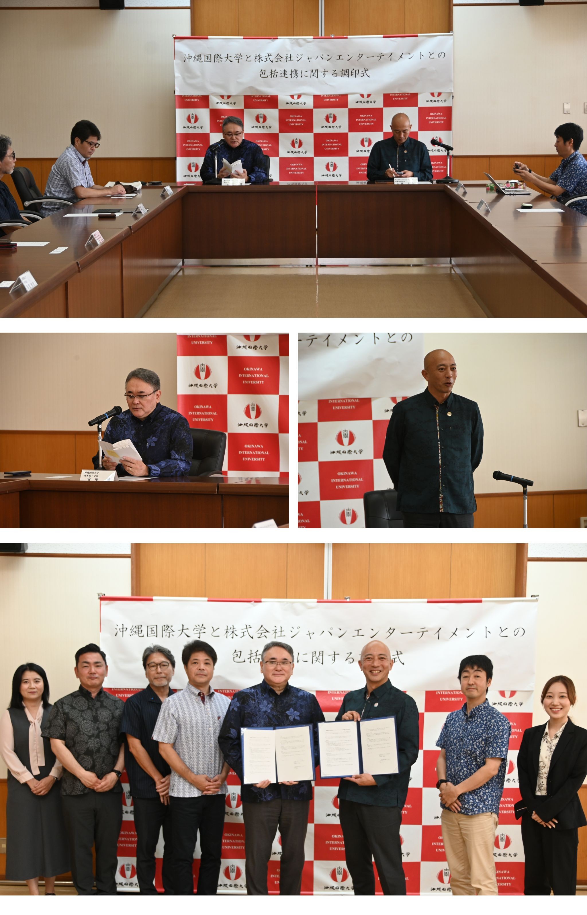 3月30日(月)、ジャングリア沖縄を運営する「株式会社ジャパンエンターテイメント」(代表取締役:加藤健史氏)との包括連携に関する協定を締結するにあたり、本学より安里肇理事長・学学長と本学役員、株式会社ジャパンエンターテイメン取締役副社長と関係者の皆さまのご出席による調印式を執り行いました。