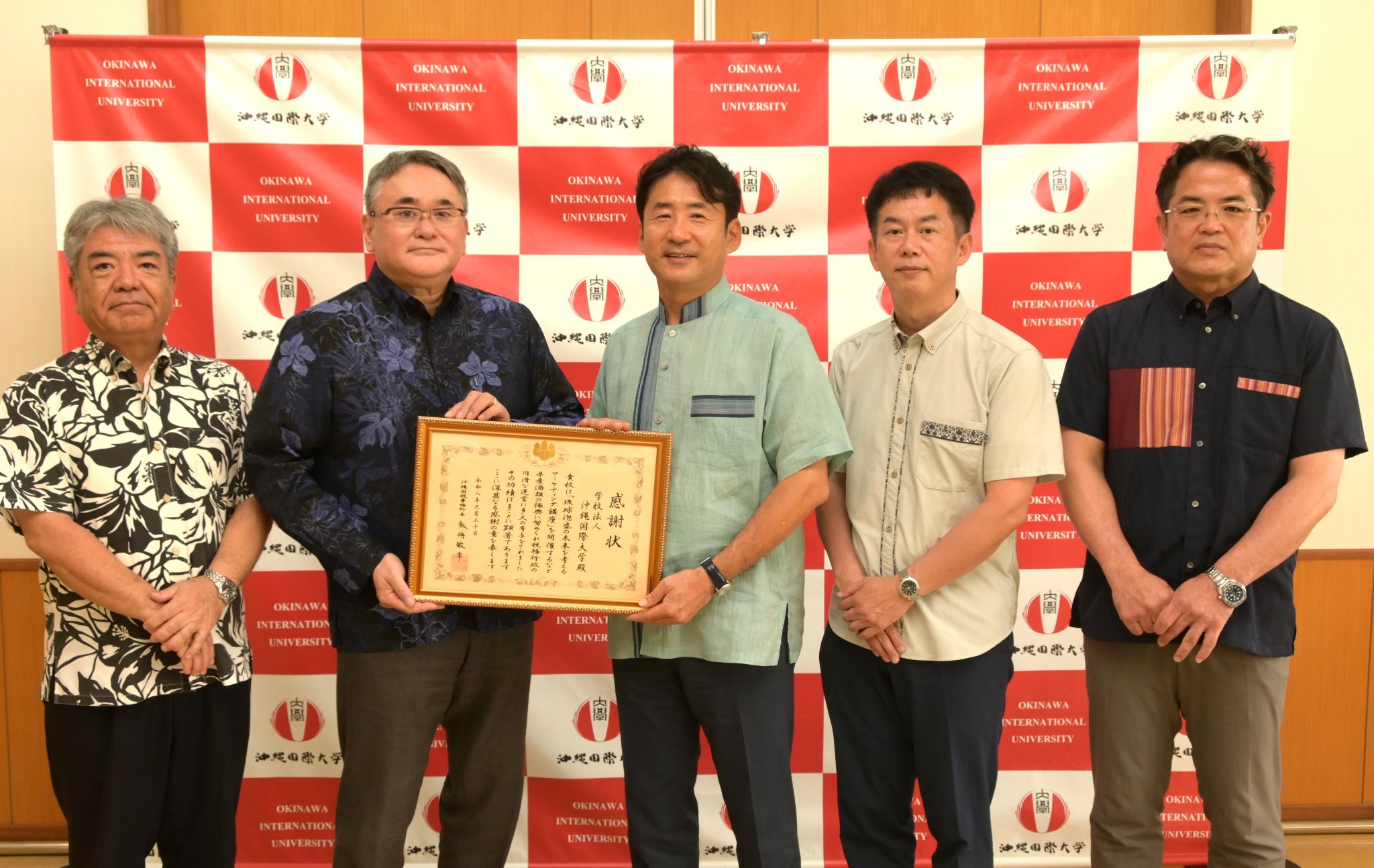 税務功労感謝状は、「納税意思の高揚等及び税務行政の推進に功績のあった個人、法人又は団体に対して感謝の意を表し、贈呈するもの」で、国税庁と沖縄県酒造組合と連携して実施した「ビジネス特別講義」(担当教員:高嶺 直)をはじめとする取組みに対し、この度贈呈されたものです。